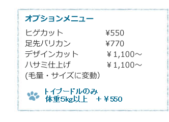 ・爪切り ・耳そうじ ・足裏バリカン ・お腹バリカン ・足まわりカット ・肛門腺絞り